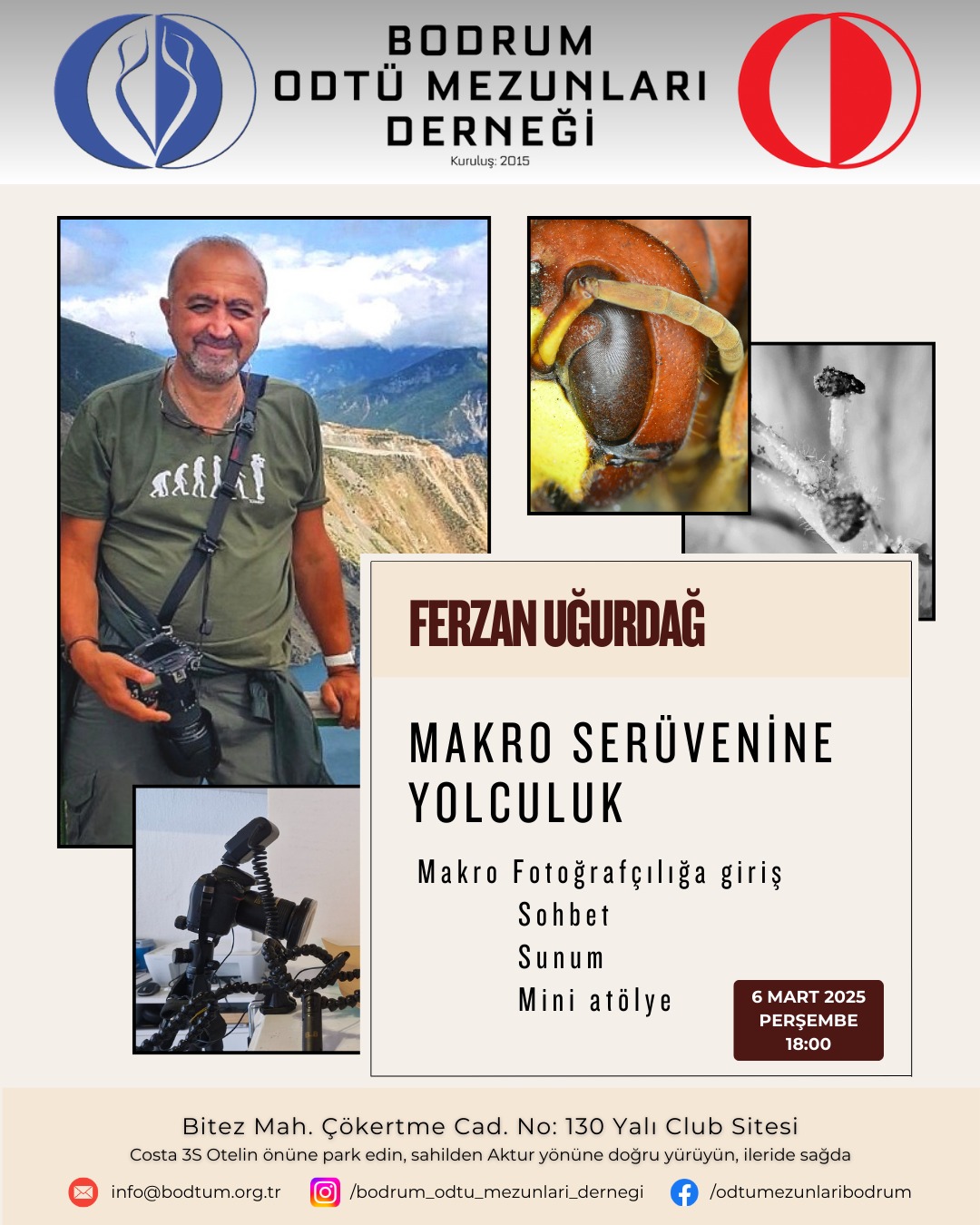 Fotoğraf sanatçısı Ferzan Uğurdağ ve eşi Zeynep Uğurdağ’ın katıldığı söyleşide makro fotoğrafçılık için gerekli tüm ekipmanları tanıdık ve gördük. Çok özel bir ilgi alanı olduğu için kalabalık değildik, ancak Ferzan hocanın sunumunda ilgilenen dostlarımız için çok aydınlatıcı bilgiler vardı.